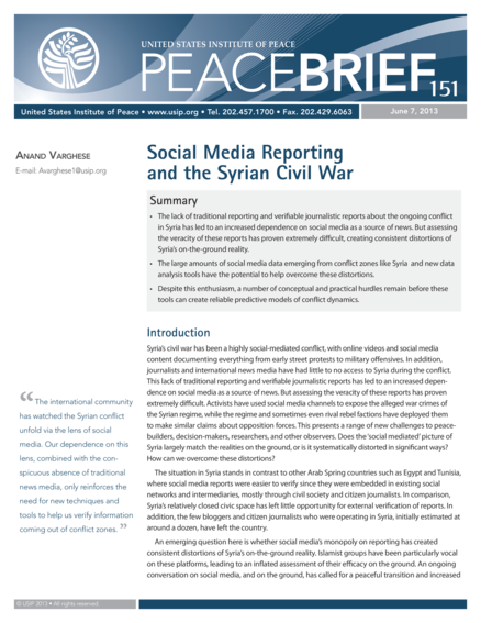 "The lack of traditional reporting and verifiable journalistic reports about the ongoing conflict in Syria has led to an increased dependence on social media as a source of news. But assessing the veracity of these reports has proven extremely difficult, creating consistent distortions of Syria’s on-the-ground reality. The large amounts of social media data emerging from conflict zones like Syria and new data analysis tools have the potential to help overcome these distortions. Despite this enthusiasm, a number of conceptual and practical hurdles remain before these tools can create reliable predictive models of conflict dynamics." (Summary)