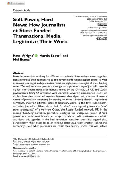"How do journalists working for different state-funded international news organizations legitimize their relationship to the governments which support them? In what circumstances might such journalists resist the diplomatic strategies of their funding states? We address these questions through a comparative study of journalists working for international news organizations funded by the Chinese, US, UK and Qatari governments. Using 52 interviews with journalists covering humanitarian issues, we explain how they minimized tensions between their diplomatic role and dominant norms of journalistic autonomy by drawing on three – broadly shared – legitimizing narratives, involving different kinds of boundary-work. In the first ‘exclusionary’ narrative, journalists differentiated their ‘truthful’ news reporting from the ‘false’ state ‘propaganda’ of a common Other, the Russian-funded network, RT. In the second ‘fuzzifying’ narrative, journalists deployed the ambiguous notion of ‘soft power’ as an ambivalent ‘boundary concept’, to defuse conflicts between journalistic and diplomatic agendas. In the final ‘inversion’ narrative, journalists argued that, paradoxically, their dependence on funding states gave them greater ‘operational autonomy’. Even when journalists did resist their funding states, this was hidden or partial, and prompted less by journalists’ concerns about the political effects of their work, than by serious threats to their personal cultural capital." (Abstract)