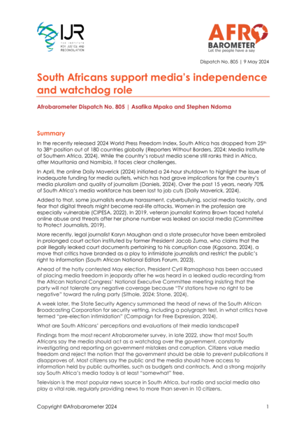 "Findings from the most recent Afrobarometer survey, in late 2022, show that most South Africans say the media should act as a watchdog over the government, constantly investigating and reporting on government mistakes and corruption. Citizens value media freedom and reject the notion that the government should be able to prevent publications it disapproves of. Most citizens say the public and the media should have access to information held by public authorities, such as budgets and contracts. And a strong majority say South Africa’s media today is at least “somewhat” free. Television is the most popular news source in South Africa, but radio and social media also play a vital role, regularly providing news to more than seven in 10 citizens." (summary)
