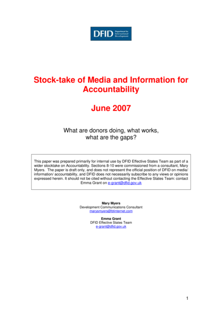 "This paper was prepared primarily for internal use by DFID Effective States Team as part of a wider stocktake on accountability. Sections 8-10 were commissioned from a consultant, Mary Myers. The paper is draft only, and does not represent the official position of DFID on media / information / accountability, and DFID does not necessarily subsrcibe to any views or opinions expressed herein." (Page 1)