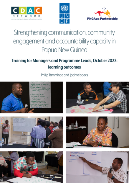 "This report provides a summary overview of the key learning outcomes from a training workshop on communication, community engagement and accountability (CCEA) held in Port Moresby, Papua New Guinea on 10-13 October 2022. The training was a means to bring together various stakeholders with an interest in CCEA issues, share experiences and develop a common understanding of how to best adapt good CCEA practices to the Papua New Guinea context. More importantly, the workshop set the foundation for developing a more consistent, coordinated and sustained approach to strengthening CCEA knowledge, capacities and skills in local, provincial and national organisations. It was also the basis for establishing a network of CCEA supporters and practitioners to promote CCEA in emergency and development programmes and decision-making processes." (Introduction, page 3)