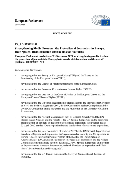 "European Parliament resolution of 25 November 2020 on strengthening media freedom: the protection of journalists in Europe, hate speech, disinformation and the role of platforms (2020/2009(INI))." (Introduction)