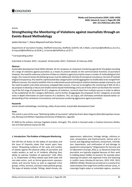 "Sustainable Development Goal (SDG) indicator 16.10.1 proposes an important monitoring agenda for the global recording of a range of violations against journalists as a means to prevent attacks on the communicative functions of journalism. However, the need for extensive collection of data on violations against journalists raises a number of methodological challenges. Our research shows the following issues must be addressed: the lack of conceptual consistency; the lack of methodological transparency; the need for sophisticated data categorisation and disaggregation to enable data to be merged from different sources; the need to establish links to understand causal and temporal relations between people and events; the need to explore and utilize previously untapped data sources. If we are to strengthen the monitoring of SDG 16.10.1, we propose to develop a robust and reliable events-based methodology and a set of tools which can facilitate the monitoring of the full range of proposed 16.10.1 categories of violations, reconcile data from multiple sources in order to adhere to the established 16.10.1 category definitions, and to further disaggregate the proposed 16.10.1 categories to provide more in-depth information on each instance of a violations. This, we argue, will ultimately contribute towards better understanding of the contextual circumstances and processes producing aggressions against journalists." (Abstract)