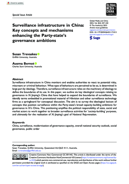"Surveillance infrastructure in China monitors and enables authorities to react to potential risky, miscreant or criminal behaviour. What type of behaviours are perceived to be so, is determined in large part by ideology. Therefore, surveillance infrastructure relies on the machinery of ideology to define the boundaries of its use. In this paper, we outline six key ideological concepts relating to governance in Xi Jinping’s China that have helped to expand the boundaries of surveillance. We identify terms embedded in promotional material of Hikvision and other surveillance technology firms as a springboard for conceptual discussion. The aim is to survey the ideological lexicon of concepts that position surveillance within the Party-state’s broad capacity-building ambitions for governance in Xi’s China. This positioning amplifies the political responsibility of state, social and market actors to work together to broaden surveillance activities for ‘society-building’ purposes, and ultimately for the realisation of Xi Jinping’s goal of National Rejuvenation." (Abstract)