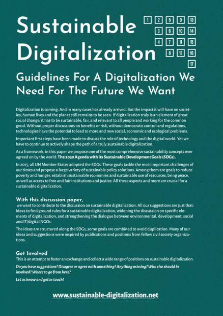 "If digitalization truly is an element of great social change, it has to be sustainable, fair, and relevant to all people and working for the common good. Without proper discussions on benefits or risk, without democratic control and regulations, technologies have the potential to lead to more and new social, economic and ecological problems. Important first steps have been made to discuss the role of technology and the digital world. Yet we have to continue to actively shape the path of a truly sustainable digitalization. As a framework, in this paper we propose one of the most comprehensive sustainability concepts ever agreed on by the world: The 2030 Agenda with its Sustainable Development Goals (SDGs)." (Page 1)
