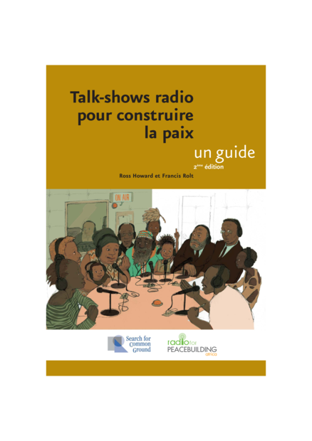 "Ce guide s’adresse principalement à toute personne qui participe à la réalisation d’un talk-show radiophonique dans une région ou un pays connaissant un conflit. Il se concentre principalement sur les conflits violents entre individus, groupes ou pays, ou qui sont susceptibles de le devenir. Certains professionnels de la radio seront peut-être familiers avec certains des concepts abordés, mais nous espérons que le guide contient un bon nombre de nouvelles idées efficaces. Chacun aimerait vivre dans une société pacifique, où la haine et la violence n’auraient pas droit de citer. La question fondamentale est de savoir comment la faire exister. Ce guide comprend une série d’exemples et d’outils pouvant stimuler des discussions de groupe consacrées à la manière dont les talk-shows peuvent contribuer à la paix. Chaque chapitre commence par un court résumé reprenant les principales idées et concepts développés. Le guide rassemble les éléments suivants: base théorique et ensemble de techniques d’analyse des conflits; instruments (illustrés par quelques exemples) à l’intention des professionnels de la radio désireux de réaliser des talk-shows pour construire la paix; définition et description des différents formats pouvant être utilisés dans un talk-show (avec leurs forces et leurs faiblesses)." (Comment utiliser ce guide, page 4)