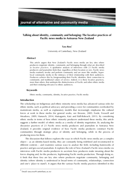"This article argues that New Zealand’s Pacific news media are key sites where producers negotiate identity, community and belonging through what are described as locative practices. A qualitative analysis of interviews with 23 Pacific media producers and journalists finds that, regardless of their location or size, Pacific news media routinely invoke and perform community and are more like smaller, hyperlocal community media in the intimacy of their relationship with their audiences. Producers achieve this by foregrounding their Pacific identities, their connection to community and traditional values of service. Indeed, it is these locative practices, more than others, that underpin the distinctiveness of Pacific and other ethnic media and their enduring relevance to ethnic audiences." (Abstract)