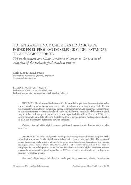 "El artículo analiza la formación de las políticas públicas de comunicación sobre la selección del estándar técnico para la televisión digital terrestre en Argentina y Chile. El estudio de carácter exploratorio y descriptivo indaga sobre las tensiones, articulaciones y dinámicas de los actores nacionales y supranacionales (Estado, radiodifusores, consorcios de las normas técnicas y sociedad civil) que participaron en el proceso a partir de fines de la década de 1990, con la incorporación del tema de la televisión digital terrestre a la agenda pública, hasta agosto/septiembre de 2009 con la adopción del sistema japonés-brasileño." (Resumen)