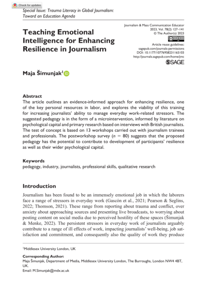 "The article outlines an evidence-informed approach for enhancing resilience, one of the key personal resources in labor, and explores the viability of this training for increasing journalists’ ability to manage everyday work-related stressors. The suggested pedagogy is in the form of a microintervention, informed by literature on psychological capital and primary research based on interviews with British journalists. The test of concept is based on 13 workshops carried out with journalism trainees and professionals. The postworkshop survey (n = 80) suggests that the proposed pedagogy has the potential to contribute to development of participants’ resilience as well as their wider psychological capital." (Abstract)