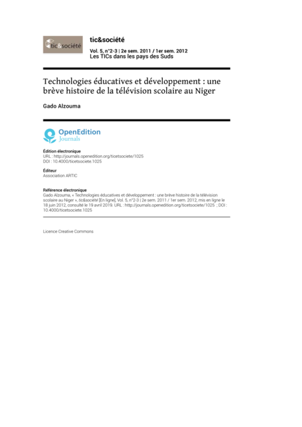 "The history of development in Africa is littered with all sorts of experiments and projects centred on new technologies often presented as a panacea to the problems of health, education, or agricultural production. The failure of some of those projects shows the limits of the technocentrist approach which has recently resurfaced in the developmentalist discourse and which is based on the idea that technology (and technology alone) can solve all the social and economic problems Africa is facing. This is the case of the educational television in Niger that was supposed to ensure a rapid access to universal education. It started in 1964 and was abandoned in 1979. It failed to transform the educational system in any significant way, the school enrolment rate in Niger still being under 60 %, 46 years after the experiment started. In this paper, I intend to show that this failure was not due to a lack of community involvement as generally advanced by project evaluations, but the result of a confrontation of divergent views of the world and society. Indeed, the educational television has become an issue of both social and political struggle, which resulted in the victory of one of the parties and the allocation of the educational television to other purposes for which it was not previously designed." (Abstract)