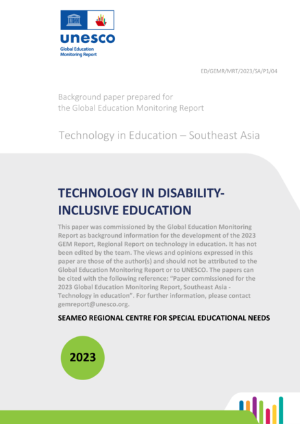 "This report outlines the actions driven towards inclusive education, including skill-based training, online learning and classroom settings, and low-tech to high-tech assistive technology (AT). Skill-based training, one of the most important skills for Persons with Disabilities (PWDs), covers life skills, vocational training, mobility training, communication and social training, and academic training. This report emphasizes the AT for enabling inclusive education for the PWDs, opening a broader perspective on technology serving this purpose, i.e., physical and digital products that assist PWDs in achieving their goals. However, eight common challenges, shared by the six countries, have been identified: the need to strengthen policies, critical budget, poor implementation, lack of training, limited access, lack of awareness, negative attitude, and cultural and language barriers. These challenges are viewed as interconnected, as none can be resolved without involving another, posing another level of challenge to be implemented, in need of strategies and proper planning for a concerted effort to put forth by each country. Nonetheless, the countries remain steadfast and continue strengthening their policies and efforts toward inclusive education for PWDs." (Abstract)