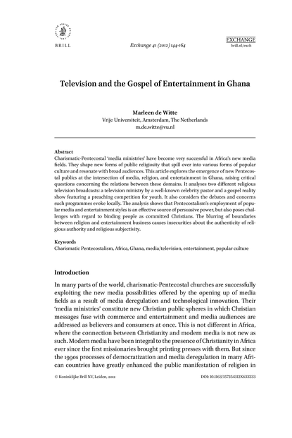 "Charismatic-Pentecostal 'media ministries' have become very successful in Africa's new media fields. They shape new forms of public religiosity that spill over into various forms of popular culture and resonate with broad audiences. This article explores the emergence of new Pentecostal publics at the intersection of media, religion, and entertainment in Ghana, raising critical questions concerning the relations between these domains. It analyses two different religious television broadcasts: a television ministry by a well-known celebrity pastor and a gospel reality show featuring a preaching competition for youth. It also considers the debates and concerns such programmes evoke locally. The analysis shows that Pentecostalism's employment of popular media and entertainment styles is an effective source of persuasive power, but also poses challenges with regard to binding people as committed Christians. The blurring of boundaries between religion and entertainment business causes insecurities about the authenticity of religious authority and religious subjectivity." (Abstract)