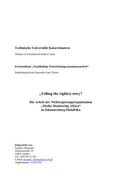 Kaiserslautern: Hausarbeit Fernstudium „Nachhaltige Entwicklungszusammenarbeit“ Technische Universität (2010), 38 pp.