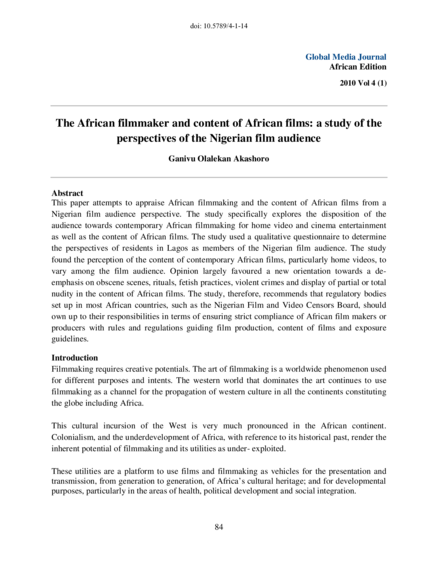 "This paper attempts to appraise African filmmaking and the content of African films from a Nigerian film audience perspective. The study specifically explores the disposition of the audience towards contemporary African filmmaking for home video and cinema entertainment as well as the content of African films. The study used a qualitative questionnaire to determine the perspectives of residents in Lagos as members of the Nigerian film audience. The study found the perception of the content of contemporary African films, particularly home videos, to vary among the film audience. Opinion largely favoured a new orientation towards a de-emphasis on obscene scenes, rituals, fetish practices, violent crimes and display of partial or total nudity in the content of African films. The study, therefore, recommends that regulatory bodies set up in most African countries, such as the Nigerian Film and Video Censors Board, should own up to their responsibilities in terms of ensuring strict compliance of African film makers or producers with rules and regulations guiding film production, content of films and exposure guidelines." (Abstract)