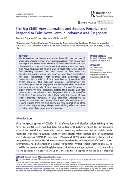 "Media freedom has deteriorated across the world over the past 15 years with populist leaders attacking journalism in both democratic and repressive states. Since the rise of online misinformation and disinformation, concern is growing that governments are using fake news language and related laws to muzzle the press. Studies find labelling reporters and their stories as fake news can threaten journalistic norms and practices and have implications for trust relationships with sources and audiences. Less understood is the effects of fake news laws on journalism. This article addresses this gap and examines consequences for journalistic practices in Singapore and Indonesia when journalists and sources are targets of fake news laws. Through 20 in-depth expert interviews with journalists, editors, their sources and fake news experts in Indonesia and Singapore, the article identifies “chill effects” on reporting when faced with the threat of new legal sanctions. However, it also identifies adaptations to newsroom practices to manage this threat. We conclude with lessons learned from the Asia Pacific on how journalists in other jurisdictions might manage the potential chilling effects on news reporting when fake news laws are in place." (Abstract)