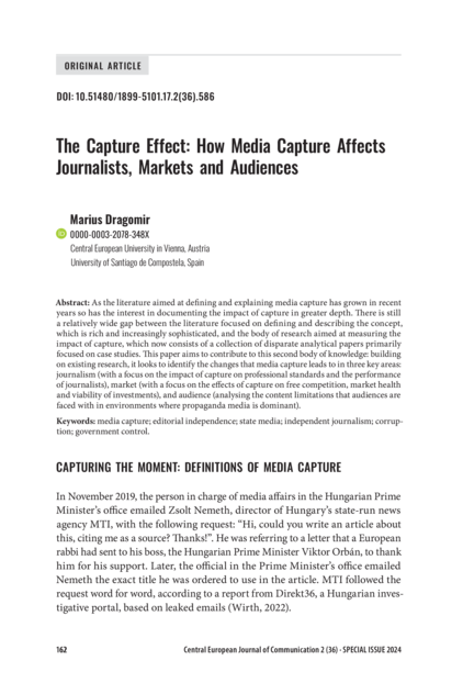 "As the literature aimed at defining and explaining media capture has grown in recent years so has the interest in documenting the impact of capture in greater depth. There is still a relatively wide gap between the literature focused on defining and describing the concept, which is rich and increasingly sophisticated, and the body of research aimed at measuring the impact of capture, which now consists of a collection of disparate analytical papers primarily focused on case studies. This paper aims to contribute to this second body of knowledge: building on existing research, it looks to identify the changes that media capture leads to in three key areas: journalism (with a focus on the impact of capture on professional standards and the performance of journalists), market (with a focus on the effects of capture on free competition, market health and viability of investments), and audience (analysing the content limitations that audiences are faced with in environments where propaganda media is dominant)." (Abstract)