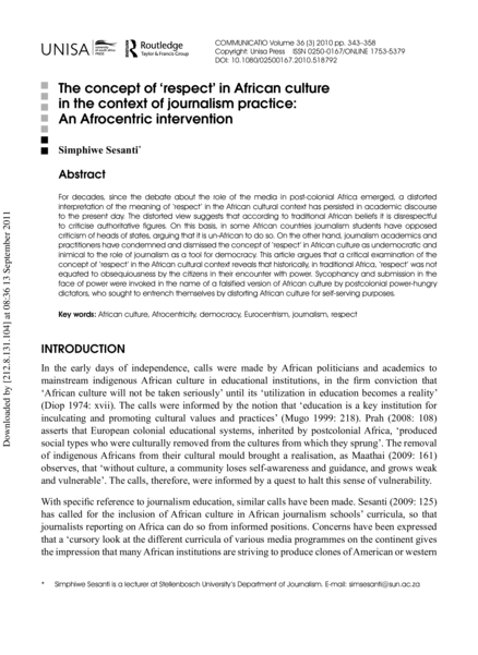 "For decades, since the debate about the role of the media in post-colonial Africa emerged, a distorted interpretation of the meaning of ‘respect’ in the African cultural context has persisted in academic discourse to the present day. The distorted view suggests that according to traditional African beliefs it is disrespectful to criticise authoritative figures. On this basis, in some African countries journalism students have opposed criticism of heads of states, arguing that it is un-African to do so. On the other hand, journalism academics and practitioners have condemned and dismissed the concept of ‘respect’ in African culture as undemocratic and inimical to the role of journalism as a tool for democracy. This article argues that a critical examination of the concept of ‘respect’ in the African cultural context reveals that historically, in traditional Africa, ‘respect’ was not equated to obsequiousness by the citizens in their encounter with power. Sycophancy and submission in the face of power were invoked in the name of a falsified version of African culture by postcolonial power-hungry dictators, who sought to entrench themselves by distorting African culture for self-serving purposes." (Abstract)