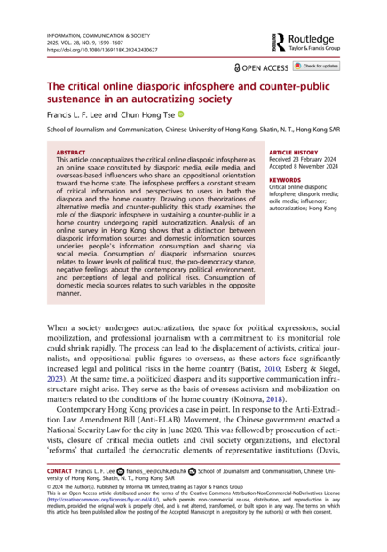 "This article conceptualizes the critical online diasporic infosphere as an online space constituted by diasporic media, exile media, and overseas-based influencers who share an oppositional orientation toward the home state. The infosphere proffers a constant stream of critical information and perspectives to users in both the diaspora and the home country. Drawing upon theorizations of alternative media and counter-publicity, this study examines the role of the diasporic infosphere in sustaining a counter-public in a home country undergoing rapid autocratization. Analysis of an online survey in Hong Kong shows that a distinction between diasporic information sources and domestic information sources underlies people’s information consumption and sharing via social media. Consumption of diasporic information sources relates to lower levels of political trust, the pro-democracy stance, negative feelings about the contemporary political environment, and perceptions of legal and political risks. Consumption of domestic media sources relates to such variables in the opposite manner." (Abstract)