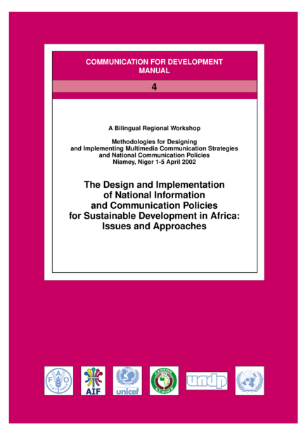 "The manual on how to design and implement a national communication development policy is a result of the work undertaken by participants of regional workshop held in Niamey, Niger in April 2002." (Page vii)