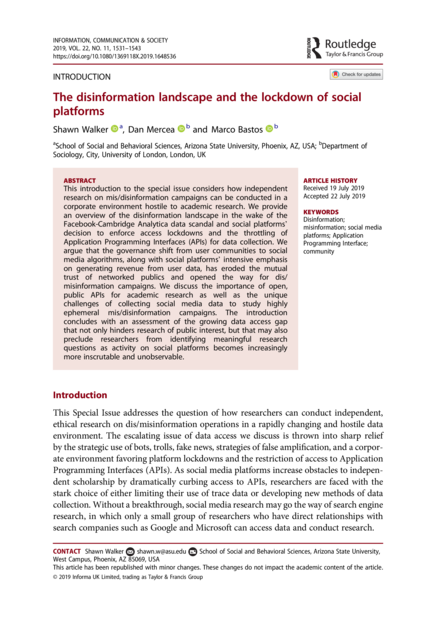 "This introduction to the special issue considers how independent research on mis/disinformation campaigns can be conducted in a corporate environment hostile to academic research. We provide an overview of the disinformation landscape in the wake of the Facebook-Cambridge Analytica data scandal and social platforms’ decision to enforce access lockdowns and the throttling of Application Programming Interfaces (APIs) for data collection. We argue that the governance shift from user communities to social media algorithms, along with social platforms’ intensive emphasis on generating revenue from user data, has eroded the mutual trust of networked publics and opened the way for dis/ isinformation campaigns. We discuss the importance of open, public APIs for academic research as well as the unique challenges of collecting social media data to study highly ephemeral is/disinformation campaigns. The introduction concludes with an assessment of the growing data access gap that not only hinders research of public interest, but that may also preclude researchers from identifying meaningful research questions as activity on social platforms becomes increasingly more inscrutable and unobservable." (Abstract)