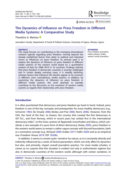 "his study focuses on contributing to the emerging international research agenda regarding press freedom, moving beyond the already established factors that relate to political and industrial norms as influences on press freedom. Its primary goal is to explore the dynamics of influence on press freedom in different media systems of the western world based on a quantitative analysis of data for 2008–2019 in 16 countries. Findings indicate that press freedom in democratic countries is severely challenged and in certain deeply worrying cases, it is steadily declining, whereas factors that influence this decline appear to be common in different, even contradictory, media systems. In addition, by examining the dynamics of influence on press freedom in different media systems, this work attempts to partially contribute to the discussion on the evolution of western media systems as regards their relationship with press freedom." (Abstract)