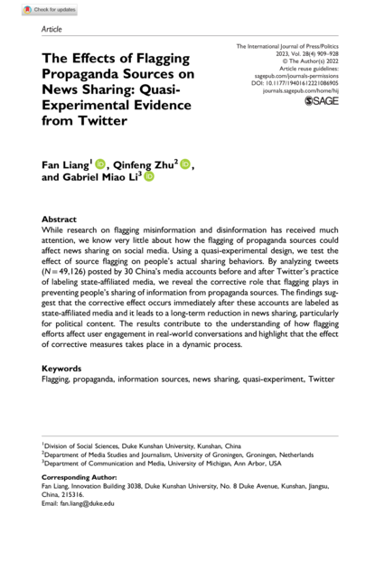 "While research on flagging misinformation and disinformation has received much attention, we know very little about how the flagging of propaganda sources could affect news sharing on social media. Using a quasi-experimental design, we test the effect of source flagging on people’s actual sharing behaviors. By analyzing tweets (N=49,126) posted by 30 China’s media accounts before and after Twitter’s practice of labeling state-affiliated media, we reveal the corrective role that flagging plays in preventing people’s sharing of information from propaganda sources. The findings suggest that the corrective effect occurs immediately after these accounts are labeled as state-affiliated media and it leads to a long-term reduction in news sharing, particularly for political content. The results contribute to the understanding of how flagging efforts affect user engagement in real-world conversations and highlight that the effect of corrective measures takes place in a dynamic process." (Abstract)