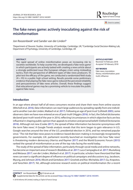 "The rapid spread of online misinformation poses an increasing risk to societies worldwide. To help counter this, we developed a ‘fake news game’ in which participants are actively tasked with creating a news article about a strongly politicized issue (the European refugee crisis) using misleading tactics, from the perspective of different types of fake news producers. To pilot test the efficacy of the game, we conducted a randomized field study (N = 95) in a public high school setting. Results provide some preliminary evidence that playing the fake news game reduced the perceived reliability and persuasiveness of fake news articles. Overall, these findings suggest that educational games may be a promising vehicle to inoculate the public against fake news." (Abstract)