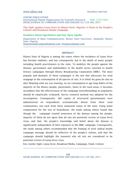 "Ebonyi State of Nigeria is among the states where the incidence of Lassa fever has become endemic; and has consequently led to the death of many people including health practitioners in the state. To mobilize the people against the disease, government and stakeholders in the health sector resorted to health literacy campaigns through Ebonyi Broadcasting Corporation (EBBC). The most popular and dramatic of these campaigns is the one that advocates for total stoppage in the consumption of all species of rats. It is titled: bu gunu be unu na ahu? Meaning what are you roasting. As rat consumption is age long habits of the majority of the Ebonyi people, particularly, those in the rural areas, it becomes incumbent that the effectiveness of the campaign notwithstanding its popularity should be empirically evaluated. Survey research method was adopted for the investigation. Consequently, 380 copies of structured questionnaire were administered on respondents systematically drawn from three rural communities, one each from three senatorial zones of the state. Using mean computation for the test of hypotheses, the study among others found that though the campaign created awareness of the disease among the people, majority of them do not agree that all rats are potential vectors of Lassa fever virus, and that, the people's knowledge and belief about the disease is significantly independent of their exposure to the EBBC campaign. Consequently, the study among others recommended that the framing of such radical health campaign message should be reflective of the people's culture, and that the campaign should highlight the reason(s) why all rats are considered to be potential vectors of Lassa fever virus." (Abstract)