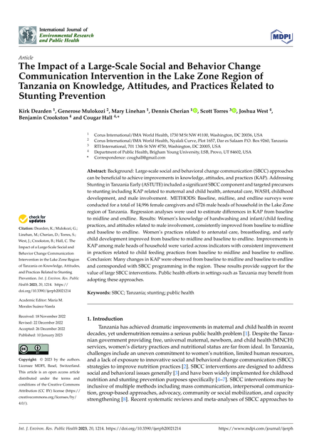 "Background: Large-scale social and behavioral change communication (SBCC) approaches can be beneficial to achieve improvements in knowledge, attitudes, and practices (KAP). Addressing Stunting in Tanzania Early (ASTUTE) included a significant SBCC component and targeted precursors to stunting including KAP related to maternal and child health, antenatal care, WASH, childhood development, and male involvement. METHODS: Baseline, midline, and endline surveys were conducted for a total of 14,996 female caregivers and 6726 male heads of household in the Lake Zone region of Tanzania. Regression analyses were used to estimate differences in KAP from baseline to midline and endline. Results: Women’s knowledge of handwashing and infant/child feeding practices, and attitudes related to male involvement, consistently improved from baseline to midline and baseline to endline. Women’s practices related to antenatal care, breastfeeding, and early child development improved from baseline to midline and baseline to endline. Improvements in KAP among male heads of household were varied across indicators with consistent improvement in practices related to child feeding practices from baseline to midline and baseline to endline. Conclusion: Many changes in KAP were observed from baseline to midline and baseline to endline and corresponded with SBCC programming in the region. These results provide support for the value of large SBCC interventions. Public health efforts in settings such as Tanzania may benefit from adopting these approaches." (Abstract)