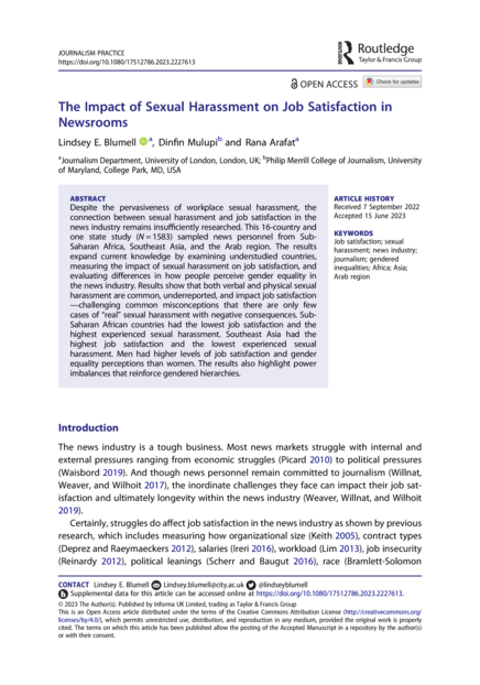 "Despite the pervasiveness of workplace sexual harassment, the connection between sexual harassment and job satisfaction in the news industry remains insufficiently researched. This 16-country and one state study (N*=*1583) sampled news personnel from Sub-Saharan Africa, Southeast Asia, and the Arab region. The results expand current knowledge by examining understudied countries, measuring the impact of sexual harassment on job satisfaction, and evaluating differences in how people perceive gender equality in the news industry. Results show that both verbal and physical sexual harassment are common, underreported, and impact job satisfaction—challenging common misconceptions that there are only few cases of “real” sexual harassment with negative consequences. Sub-Saharan African countries had the lowest job satisfaction and the highest experienced sexual harassment. Southeast Asia had the highest job satisfaction and the lowest experienced sexual harassment. Men had higher levels of job satisfaction and gender equality perceptions than women. The results also highlight power imbalances that reinforce gendered hierarchies." (Abstract)