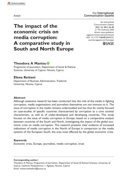"Although extensive research has been conducted into the role of the media in fighting corruption, media organisations and journalists themselves are not immune to it. The issue of corruption in the media remains understudied and has thus far mainly focused on case-studies of specific countries characterised by corruption as a core societal characteristic, as well as of under-developed and developing countries. This study focuses on the issue of media corruption in Europe, based on a comparative analysis between countries of the South and North, investigating the impact of the global economic crisis on media corruption. The research presents clear evidence of increased indications of media corruption in the North of Europe in comparison to the media systems of the European South, the area most affected by the global economic crisis." (Abstract)