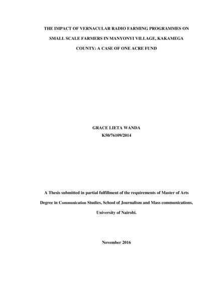 The Impact of Vernacular Radio Farming Programmes on Small Scale Farmers in Manyonyi Village, Kakamega County: A Case of 'One Acre Fund'