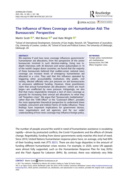 "We examine if and how news coverage influences governments’ humanitarian aid allocations, from the perspective of the senior bureaucrats involved in such decision-making. Using rare in-depth interviews with 30 directors and senior policymakers in 16 of the world’s largest donor countries, we found that the majority of these bureaucrats believed that sudden-onset, national news coverage can increase levels of emergency humanitarian aid allocated to a crisis. They said that this influence operated by triggering other accountability institutions (the public, civil society, elected officials) who put pressure on aid bureaucracies to announce additional funding. However, these practitioners claim that annual humanitarian aid allocations—which are much larger—are unaffected by news pressure. Intriguingly, we also find that many respondents interpret a lack of news coverage as grounds for increasing their annual aid allocations to what they call “forgotten crises”. We argue that “bureaucratic mediatisation”, rather than the “CNN Effect” or the “Cockroach Effect”, provides the most appropriate theoretical perspective to understand these multiple, concurrent and indirect forms of media influence. These findings have important implications for government donors, news organisations and aid agencies, and for our wider understanding of how news coverage may influence foreign policy." (Abstract)