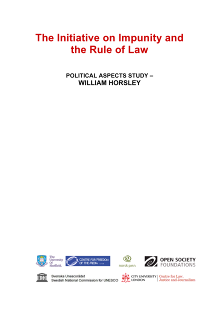 "The Initiative on Impunity and the Rule of Law is a global project of the Centre for Freedom of the Media (CFOM) at the University of Sheffield and the Centre for Law, Justice and Journalism (CLJJ) at City University, London. Our aims are to provide an independent platform to assess the effectiveness of existing legal, political and institutional safeguards against violence directed at journalists because of their professional work; and to present the case for more effective international mechanisms to counter such crimes of violence and to end impunity." (Abstract)
