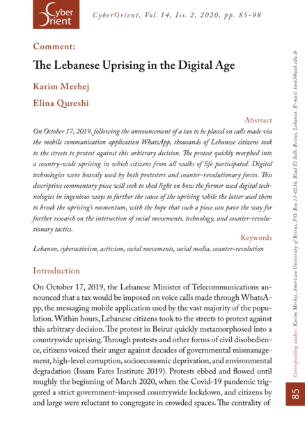 "On October 17, 2019, following the announcement of a tax to be placed on calls made via the mobile communication application WhatsApp, thousands of Lebanese citizens took to the streets to protest against this arbitrary decision. The protest quickly morphed into a country-wide uprising in which citizens from all walks of life participated. Digital technologies were heavily used by both protesters and counter-revolutionary forces. This descriptive commentary piece will seek to shed light on how the former used digital technologies in ingenious ways to further the cause of the uprising while the latter used them to break the uprising’s momentum, with the hope that such a piece can pave the way for further research on the intersection of social movements, technology, and counter-revolutionary tactics." (Abstract)