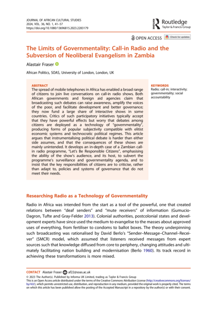 "The spread of mobile telephones in Africa has enabled a broad range of citizens to join live conversations on call-in radio shows. Both African governments and foreign aid agencies claim that broadcasting such debates can raise awareness, amplify the voices of the poor, and facilitate development and better governance; they now fund a large share of interactive shows in some countries. Critics of such participatory initiatives typically accept that they have powerful effects but worry that debates among citizens are deployed as a technology of “governmentality”, producing forms of popular subjectivity compatible with elitist economic systems and technocratic political regimes. This article argues that instrumentalising political debate is harder than either side assumes, and that the consequences of these shows are mainly unintended. It develops an in-depth case of a Zambian callin radio programme, “Let’s Be Responsible Citizens”, emphasising the ability of the show’s audience, and its host, to subvert the programme’s surveillance and governmentality agenda, and to insist that the key responsibilities of citizens are to criticise, rather than adapt to, policies and systems of governance that do not meet their needs." (Abstract)