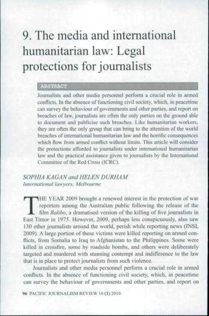 "Journalists and other media personnel perform a crucial role in armed conflicts. In the absence of functioning civil society, which, in peacetime can survey the behaviour of governments and other parties, and report on breaches of law, journalists are often the only parties on the ground able to document and publicise such breaches. Like humanitarian workers, they are often the only group that can bring to the attention of the world breaches of international humanitarian law and the horrific consequences which flow from armed conflict without limits. This article will consider the protections afforded to journalists under international humanitarian law and the practical assistance given to journalists by the International Committee of the Red Cross (ICRC)." (Abstract)