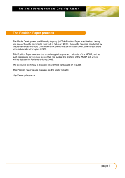 "Government has taken the bold step of setting up an independent agency that will address some of the problems of media development and diversity in South Africa. It is important to stress that the proposed Media Development and Diversity Agency (MDDA) will not interfere in the content of any newspaper, television or radio station. Its primary purpose is to help create an enabling environment for media to develop and meet the diverse needs of all South Africans. This includes those marginalised because of factors such as gender, race, disability, geographical location, class or income, as well as marginalised schools of thought. While the scale of what is required to fully address media imbalances will be beyond the scope of the MDDA, it will play a key catalytic role through its funding, facilitation and research. This Position Paper was formulated through consultation with a wide range of stakeholders, including statutory bodies, the media and advertising industry, community media, NGOs, academics and trade unions. It is now government policy, and informs the draft legislation that will be presented to Parliament for consideration during 2002." (Foreword, page 6)