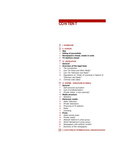 "This report provides a comprehensive overview of the role and position of the media in Tajikistan. The contributors explain that the weakness of the media there is due to many different reasons and linked to the general political, social and economic circumstances in the country. The report explains how the consequences of the civil war, the loss of competent journalists, the high costs of production, the self-censorship pressure exerted on journalists and editors by politicians not used to relatively free press have all helped inhibit the development of the media in the country." (Digital Library, ETh Zürich Center for Security Studies)