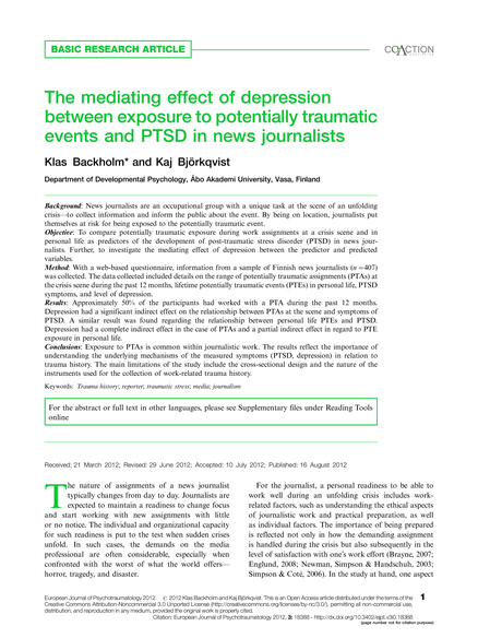 Conclusions: Exposure to PTAs is common within journalistic work. The results reflect the importance of understanding the underlying mechanisms of the measured symptoms (PTSD, depression) in relation to trauma history. The main limitations of the study include the cross-sectional design and the nature of the instruments used for the collection of work-related trauma history." (Abstract)