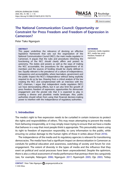 The National Communication Council: Opportunity or Constraint for Press Freedom and Freedom of Expression in Cameroon?