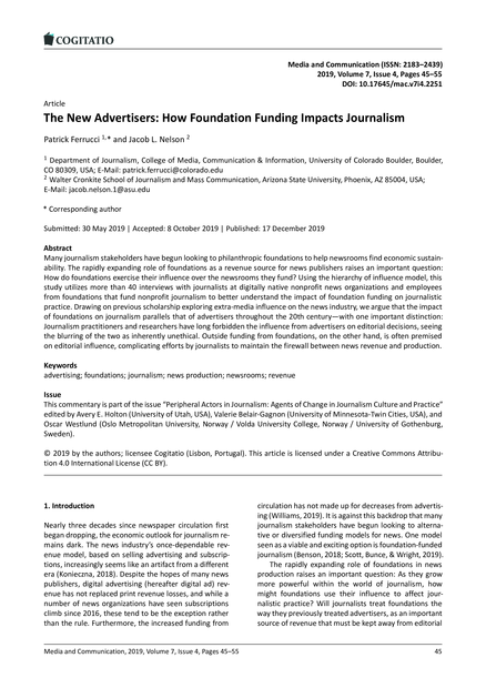 "Many journalism stakeholders have begun looking to philanthropic foundations to help newsrooms find economic sustainability. The rapidly expanding role of foundations as a revenue source for news publishers raises an important question: How do foundations exercise their influence over the newsrooms they fund? Using the hierarchy of influence model, this study utilizes more than 40 interviews with journalists at digitally native nonprofit news organizations and employees from foundations that fund nonprofit journalism to better understand the impact of foundation funding on journalistic practice. Drawing on previous scholarship exploring extra-media influence on the news industry, we argue that the impact of foundations on journalism parallels that of advertisers throughout the 20th century—with one important distinction: Journalism practitioners and researchers have long forbidden the influence from advertisers on editorial decisions, seeing the blurring of the two as inherently unethical. Outside funding from foundations, on the other hand, is often premised on editorial influence, complicating efforts by journalists to maintain the firewall between news revenue and production." (Abstract)