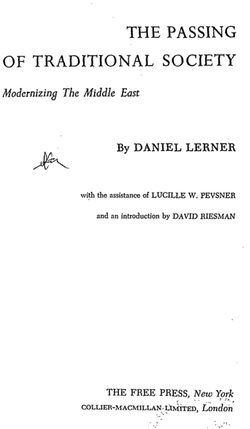 "Daniel Lerner's 1958 book 'The Passing of Traditional Society' was central in shaping Cold War-era ideas about the use of mass media and culture to promote social and economic progress in postcolonial nations. Based on a study of the effectiveness of propaganda in the Middle East, Lerner's book claimed that exposure to American media messages could motivate "traditional" people in the postcolonial nations to become "modern" by cultivating empathy for American ideas, goods, and ways of life." (https://www.jstor.org)