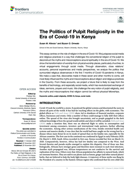 "This essay centres on the role of religion in the era of Covid-19. We juxtapose social media and religious practices in a way that challenges the conventional religion of the pulpit to deconstruct the myths and misconceptions around spirituality in the era of Covid-19. We show the transformation of worship from physical worship places, particularly churches, to virtual engagements through social media. Through observation, close relations’ accounts, personal experiences and media perspectives, we analyze the politics that surrounded religious observances in the first 7 months of Covid-19 pandemic in Kenya. We make a case that, discoveries made in these seven and other months to come, will most likely influenced the myths and misconceptions about religion and religious practices in the country. From these accounts, we project a future that is likely to reap from the benefits of technology, and especially social media, which has revolutionized exchange of ideas, sermons, prayers and music. We challenge the very notion of pulpit religiosity, and the myths and misconceptions that religion cannot be without physical fellowships." (Abstract)