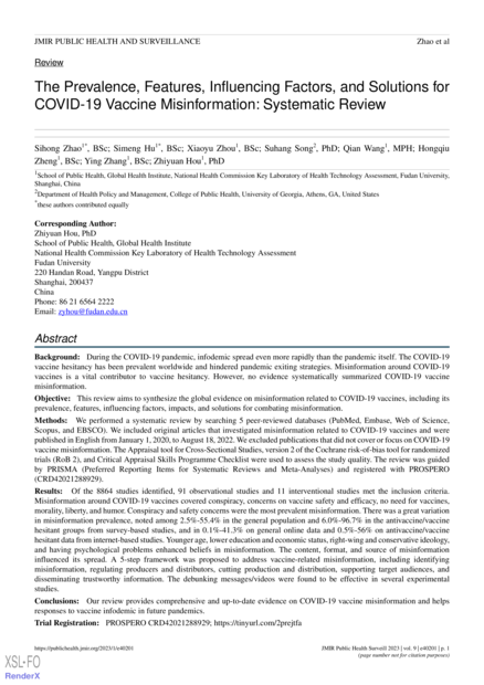 "This review aims to synthesize the global evidence on misinformation related to COVID-19 vaccines, including its prevalence, features, influencing factors, impacts, and solutions for combating misinformation. We performed a systematic review by searching 5 peer-reviewed databases (PubMed, Embase, Web of Science, Scopus, and EBSCO). We included original articles that investigated misinformation related to COVID-19 vaccines and were published in English from January 1, 2020, to August 18, 2022 [...] Of the 8864 studies identified, 91 observational studies and 11 interventional studies met the inclusion criteria. Misinformation around COVID-19 vaccines covered conspiracy, concerns on vaccine safety and efficacy, no need for vaccines, morality, liberty, and humor. Conspiracy and safety concerns were the most prevalent misinformation. There was a great variation in misinformation prevalence, noted among 2.5%-55.4% in the general population and 6.0%-96.7% in the antivaccine/vaccine hesitant groups from survey-based studies, and in 0.1%-41.3% on general online data and 0.5%-56% on antivaccine/vaccine hesitant data from internet-based studies. Younger age, lower education and economic status, right-wing and conservative ideology, and having psychological problems enhanced beliefs in misinformation. The content, format, and source of misinformation influenced its spread. A 5-step framework was proposed to address vaccine-related misinformation, including identifying misinformation, regulating producers and distributors, cutting production and distribution, supporting target audiences, and disseminating trustworthy information. The debunking messages/videos were found to be effective in several experimental studies." (Abstract)