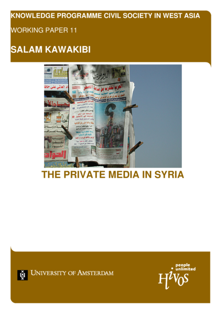 "This working paper is about the private media in Syria. A new publishing law was passed in 2001, which allowed the private sector to re-enter the media industry, having been banned from it since 1963. The relatively high number of approved publications since 2001 provides the Ministry of Information with an argument in its favour, which it uses every time the media situation in Syria is discussed. However, even though the new law does not impose censorship as a prerequisite, it does remain very repressive and contains an arsenal of restrictions that complicate the work of journalists. It also affects all other forms of publication in Syria and entering the country from abroad, as well as printing presses, with sanctions ranging from fines to imprisonment. In appearance, there are many indicators of an increased openness, but closer scrutiny of the way that the media actually function gives a better understanding of this distinctively Syrian “static reform." (http://www.search4dev.nl)