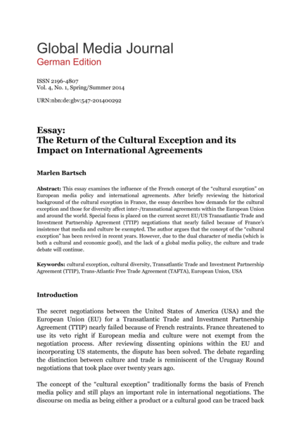 "This essay examines the influence of the French concept of the “cultural exception” on European media policy and international agreements. After briefly reviewing the historical background of the cultural exception in France, the essay describes how demands for the cultural exception and those for diversity affect inter-/transnational agreements within the European Union and around the world. Special focus is placed on the current secret EU/US Transatlantic Trade and Investment Partnership Agreement (TTIP) negotiations that nearly failed because of France’s insistence that media and culture be exempted. The author argues that the concept of the “cultural exception” has been revived in recent years. However, due to the dual character of media (which is both a cultural and economic good), and the lack of a global media policy, the culture and trade debate will continue." (Abstract)