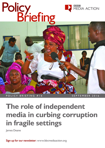 "This policy briefing examines the prospects for media being able to play that role, especially in fragile states. It concludes that the evidence supporting the effectiveness of media as an accountability actor continues to mount even when the performance of other anti-corruption measures are called into question. It looks at the increasing pressures facing independent media in fragile states, especially those of political co-option and a reduction in media freedom. It suggests that these pressures are intensifying precisely because media is so effective at holding power to account and exposing corruption. It argues that independent media need more attention from international development actors not only financially but also through their strategic focus and influence they can bring to bear to supporting media freedom. Without it, such media are likely to struggle to survive and corruption can be expected to increase." (BBC Media Action website)