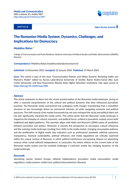 "This article endeavors to delve into the recent transformation of the Romanian media landscape, aiming to offer a nuanced comprehension of the cultural and political dynamics that have influenced journalistic practices. The Romanian media environment has undergone swift changes, transitioning from a monolithic structure to one increasingly driven by commercial interests, all while navigating economic and political pressures. The shift toward a free-market framework has not only reshaped the social and political fabric but has also significantly impacted the media sector. This article posits that the Romanian media landscape is shaped by the interplay of cultural, economic, and political forces, evident in journalistic outputs across both traditional and digital platforms. This assertion aligns with Hallin and Mancini's (2004) notion of parallelism between journalism and politics. Moreover, it extends this perspective to encompass cultural influences and the evolving media landscape resulting from shifts in the media market, changing consumption patterns, and the proliferation of digital media. Key indicators such as professional standards, editorial autonomy, transparency, financial sustainability, political influence, and media regulations are critically examined within the unique context of Romania, in which political interference and growing reliance on advertising revenue often curtail editorial independence. In conclusion, the article reflects on the current state of the Romanian media system and the manifold challenges it confronts amidst the changing dynamics of the media landscape." (Abstract)