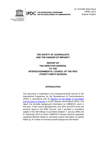 Status of the Judicial Inquiries of Journalists Killed from 2006 to 2013 -- List of Killings of Journalists Condemned by the Director-General in 2012 and 2013 -- UNESCO General Conference Resolution -- International and Regional Instruments on the Safety of Journalists